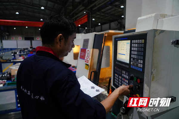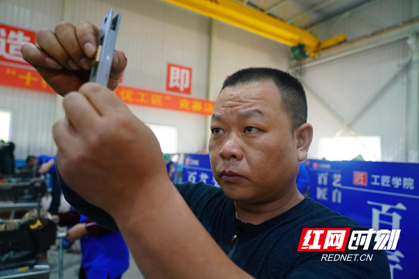 在长沙高新技术工程学校普通车工实操决赛会场。这种半自动的车床加工需要选手对车床又非常熟练的操控技术,最能体现精益求精专心专注的工匠精神,这就要求工人必须有扎实的专业基础知识和过硬的技术技能。