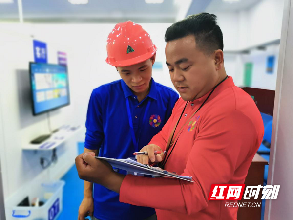 信息网络布设中的智能组网与智能家居赛项,裁判钟定权根据任务书要求对选手交付作业逐项进行检查,并评判打分。从跟用户打招呼开始,穿鞋套、布地垫等细节动作都成为比赛考核内容,体现出了智能组网技术工人的服务水平。