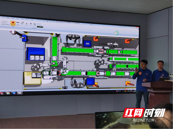 工业机器人应用技术决赛现场,参赛队员通过讲演的形式向在场的评委展示自己团队的产品设计。