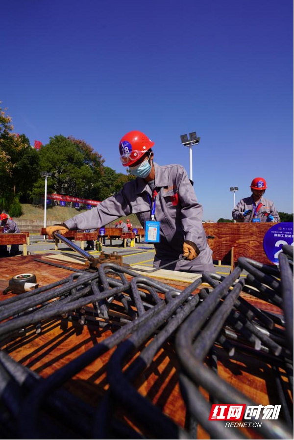 谁说女子不如儿郎,钢筋工技能竞赛决赛进入最后的冲刺阶段,场上的女选手正在完成最后的一道工序 。
