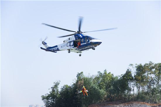 伴随着救援直升机轰鸣的螺旋桨声,一架涂装有醒目 " 长沙应急 " 字样的直升机在接到长沙市应急指挥中心的指令后,紧急升空开展索降救援演示飞行。记者在现场看到,直升机机上的绞车手将救生员和专业折叠担架通过绞车钢索运送至地面,救生员落地后迅速将 " 伤员 " 固定于救援担架,随后绞车手收起绞盘,将救生员和 " 伤员 " 安全拉升至机舱后,快速前往医院,于艰险时刻托起生命的希望。
