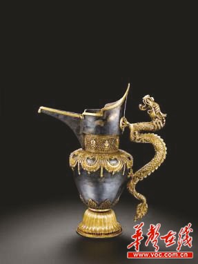 僧帽壶是元代创烧的瓷器样式,因造型似西藏萨迦法王之僧帽而得名,后来从瓷延伸至多种材质,用途多样,是藏传佛教地区常用的一种器具。本品阔颈,带流,流口与颈部有鸭嘴状流槽相通,鼓肩、束腹,高圈足。壶身通体银质,口沿之回纹、壶颈“八吉祥”、壶肩之璎珞装饰、莲瓣高足座以及一侧的游龙状把手,均施以鎏金技法。整体造型优美,高贵富丽,是同类器具的高档产品。(本文图片由长沙博物馆提供。)