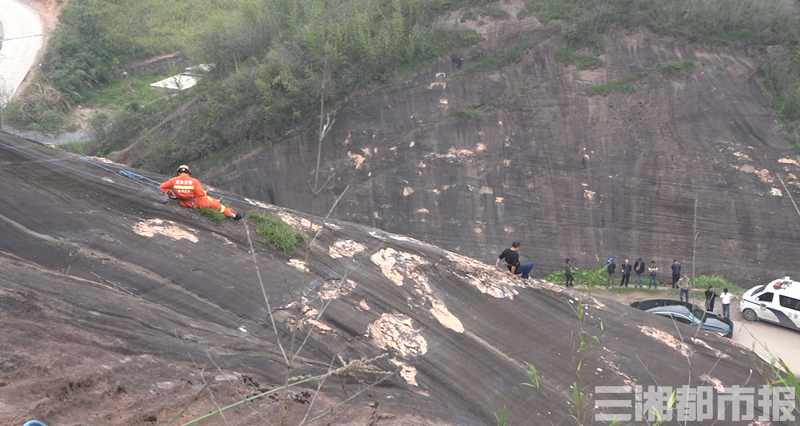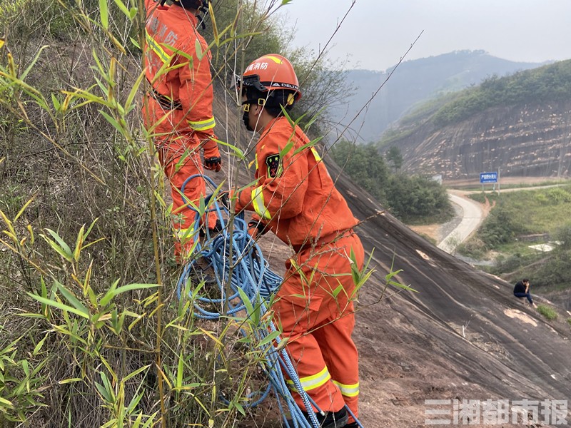 救援人员员立即联同现场公安等部门协同展开救援。因现场位处马路旁,救援人员首先拉起警戒线,维护现场秩序,随后带好安全绳索、安全腰带等救援器材登上山顶做好固定点,一名消防员通过绳索吊降到男子所在位置,为其系好腰带和牵引安全绳索。为了保证被困男子的安全,救援人员与男子全程保持沟通,让其保持冷静,指引下山方向。