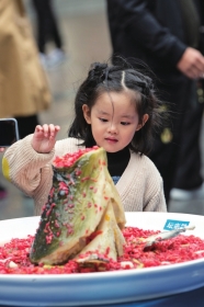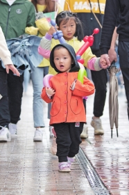 10月4日,长沙黄兴路,一个小朋友被路中的一盆高仿坛宗剁椒鱼头吸引。还有一个小朋友兴奋地行走在步行街。图/记者谢长贵