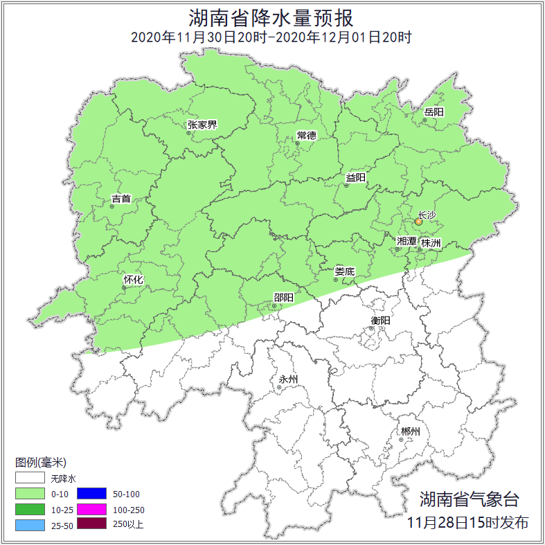 11月28日20时至29日20时,永州、郴州、衡阳、邵阳南部、岳阳、长沙、株洲、湘潭小雨转多云,其他地区阴天到多云,29日早晨湘西、湘北局地有雾;北风3~4级;最高气温11~13℃;最低气温湘西、湘北3~5℃,其他地区5~7℃。