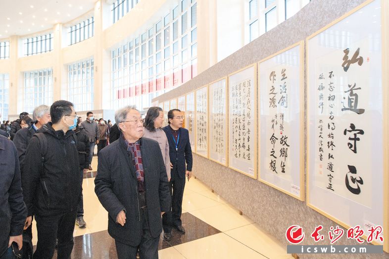 第二届书堂山当代文人书法周书法美术作品展上,书法家们一起观看展览。长沙晚报全媒体记者 邹麟 摄