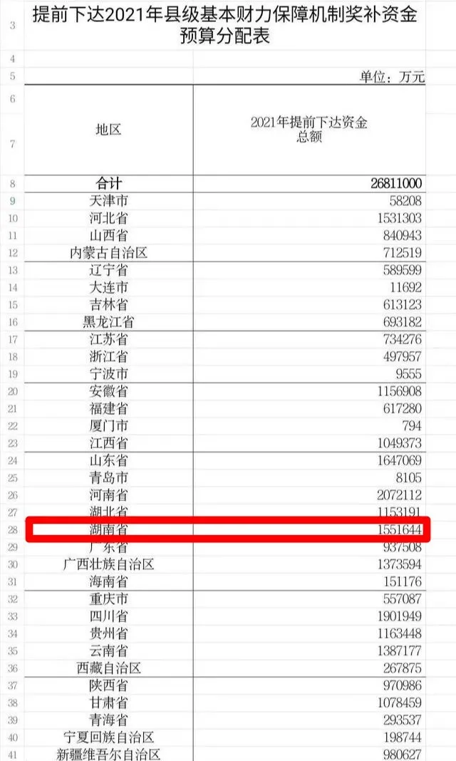 11月13日,财政部官网发布通知表示,提前下达2021年县级基本财力保障机制奖补资金预算,奖补资金涉及33个省(区、市),总额为2681.1亿元。其中,湖南省获1551644万元。