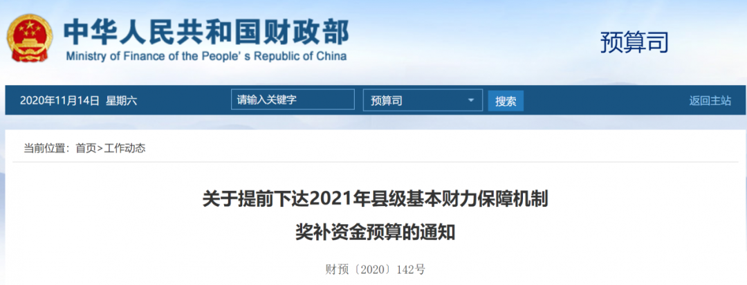 财政部表示,为提高预算完整性,加快支出进度,现提前下达相关省(区、市)2021年县级基本财力保障机制奖补资金,项目代码Z135110059001,列入2021年政府收支分类科目“1100207县级基本财力保障机制奖补资金收入”预算科目,待2021年预算年度开始后,按程序拨付使用。