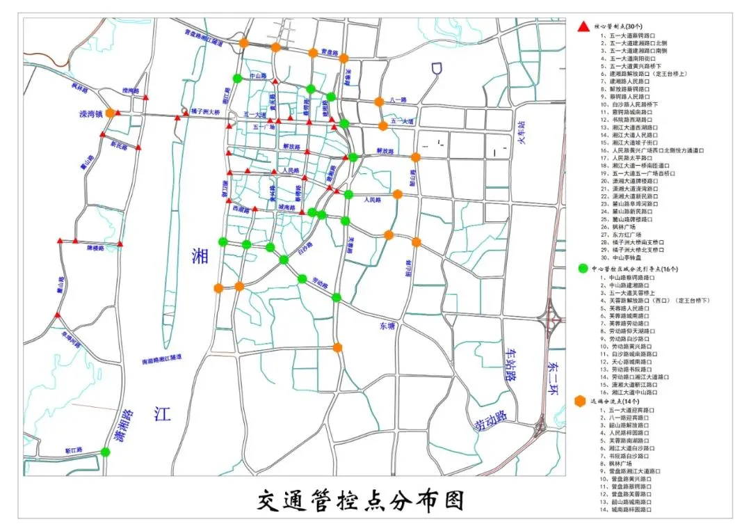 长沙交警在中心管控区域设30个核心交通管制点,中心管控区域设16个分流引导点,当核心管制区交通流量饱和时,将对车辆实行分流,减轻交通压力。当五一商圈周边车辆超饱和,分流引导点不能继续承当车辆分流功能时,将采取摆放反光锥、水马物理隔离等方式,同时迅速在14个远端分流点启动分流卡车措施,控制往中心区域行驶车辆。