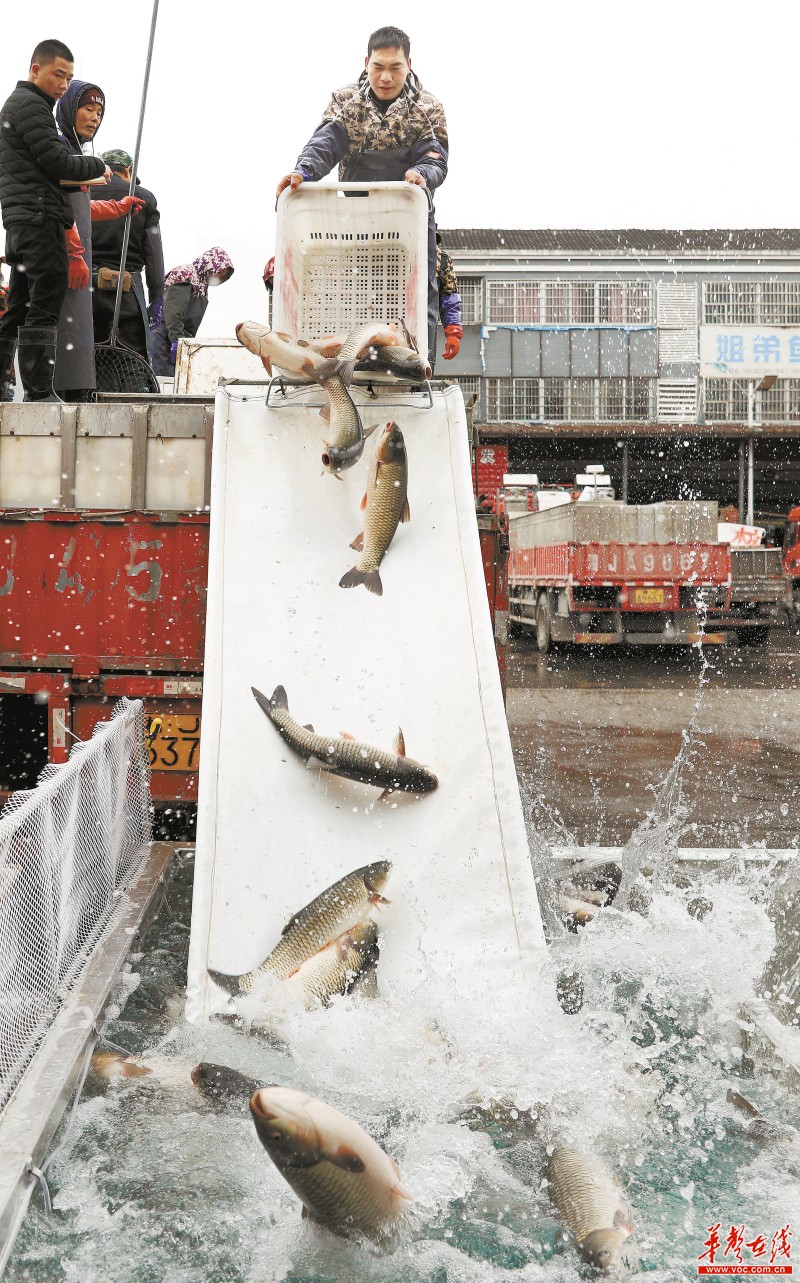 12月16日,常德水产大市场,鱼商将一批新到的青鱼下货。目前,该市场内水产品供销两旺,价格稳定,日成交量达600吨左右。