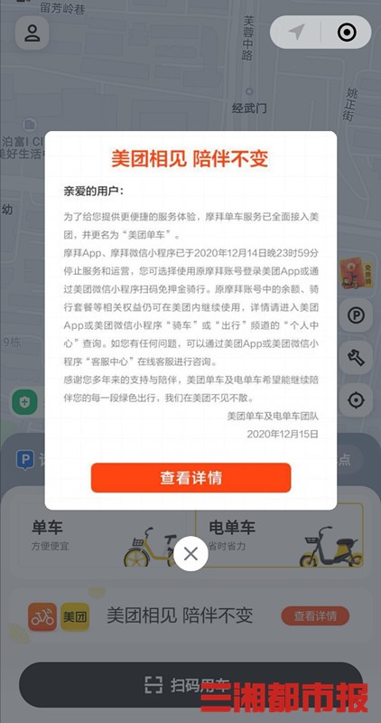 华声在线12月15日讯(三湘都市报·华声在线记者 潘显璇 实习生 陈瑜玲)今天,摩拜APP、摩拜微信小程序停止服务和运营,摩拜单车全面接入美团并更名“美团单车”。这意味着,曾经红遍大江南北的摩拜单车正式谢幕。