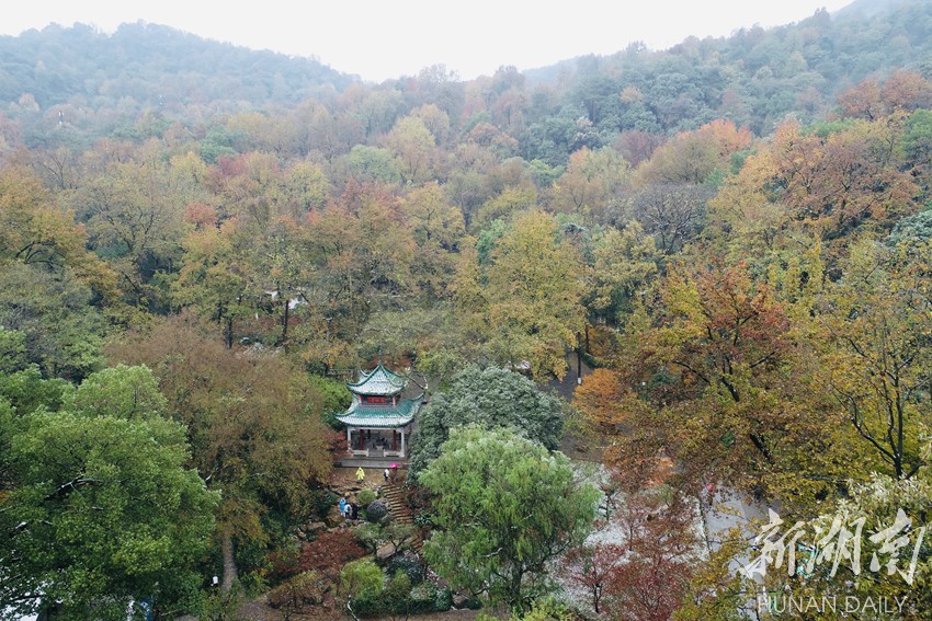 12月14日,长沙市岳麓山爱晚亭景区,市民在雪中参观。湖南日报记者 李健 摄