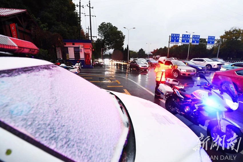 12月14日早晨7时,长沙猴子石大桥东侧桥头,交警在疏导车流有序通行。为应对低温雨雪冰冻天气,长沙公安交警支队启动三级勤务模式,全员提早到岗到位,确保道路交通安全畅通。湖南日报记者 徐行 摄