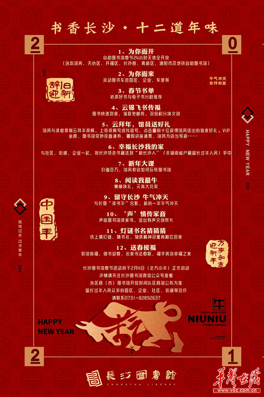 线下,读者可参加橘洲讲坛湖湘新春系列讲座,听长沙三爹讲长沙旧日过年民俗,听谜语大师解析特色谜语;孩子们可以参加童心向党手抄报征集、阅读我最“牛”集章换礼;到图书馆拍书香大家庭的全家福,一起祈福2021;参加滩头年画主题展、和传承人一起体验传统手艺之乐趣;在12家地铁自助图书馆借书参加“云锦传福”赢取精美图书。