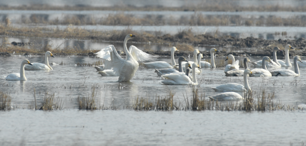 本次调查中,共监测到国家重点保护鸟类7种1.05万余只。其中国家一级保护鸟类有3种161只,分别为黑鹳106只、白鹤47只、白头鹤8只;国家二级保护鸟类4种,包括白琵鹭、小天鹅、灰鹤、白额雁等。