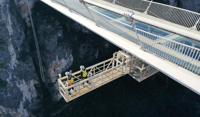 1月19日,湖南张家界大峡谷景区玻璃桥巡检员李栓(左)、罗克文对玻璃桥主缆索夹进行检查(无人机照片) 。