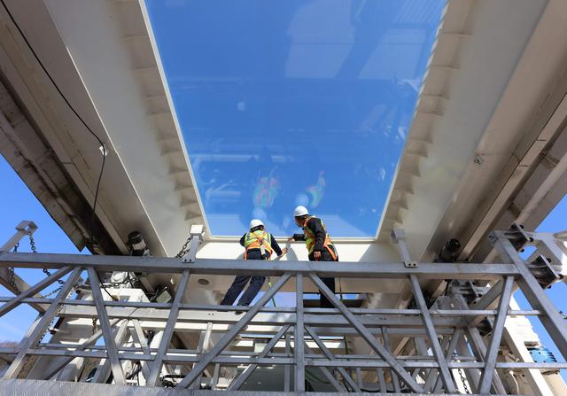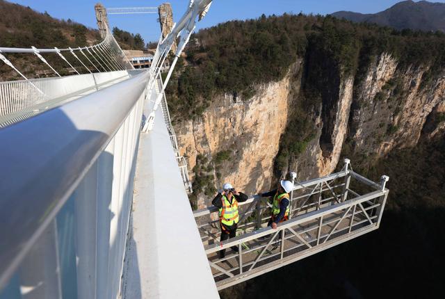 1月19日,湖南张家界大峡谷景区玻璃桥巡检员李栓(右)、罗克文对玻璃桥面进行检查。