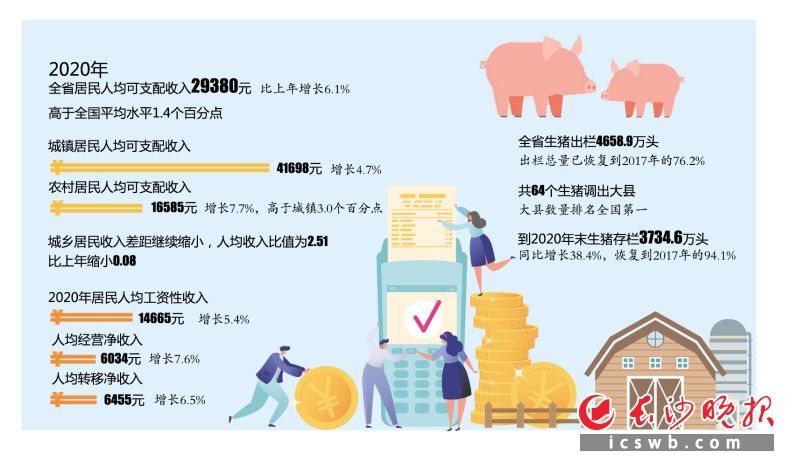 2020年,全省居民人均可支配收入29380元,比上年增长6.1%,高于全国平均水平1.4个百分点。