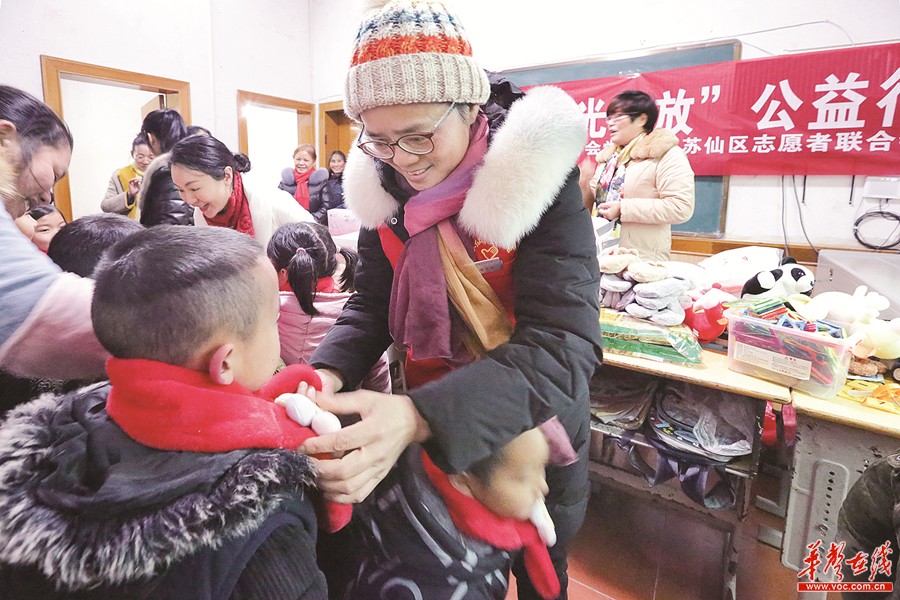 1月8日,志愿者为留守孩子系上新围巾。当天,郴州市苏仙区志愿者联合会携手爱心人士来到该区良田镇百丈村小学,给这里的15名孩子和3位老师送去了围巾、手套、暖宝宝等爱心物资。
