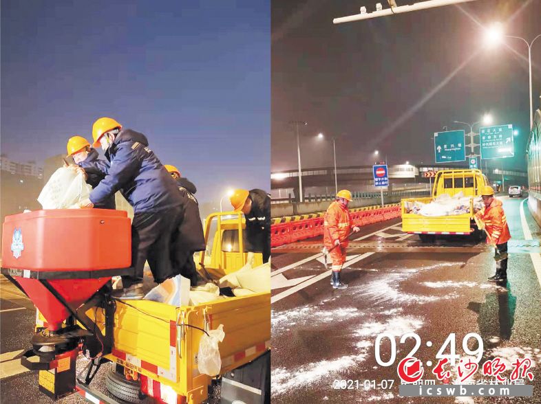 6日晚到7日凌晨,长沙桥隧工作人员对全线进行巡查,开展24小时值守,加强桥梁、隧道巡查和融雪防冻等工作,并在易结冰的高架、隧道口、涉水段桥梁、迎风口、匝道等路段撒融雪盐,防止路面结冰。