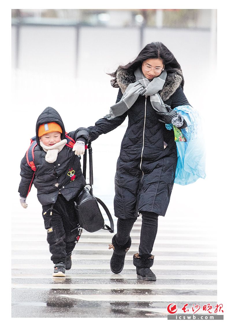 受新一轮寒潮影响,长沙迎来低温雨雪冰冻天气。金星路上一名家长带着孩子过马路,冷感明显。长沙晚报全媒体记者 邹麟 摄