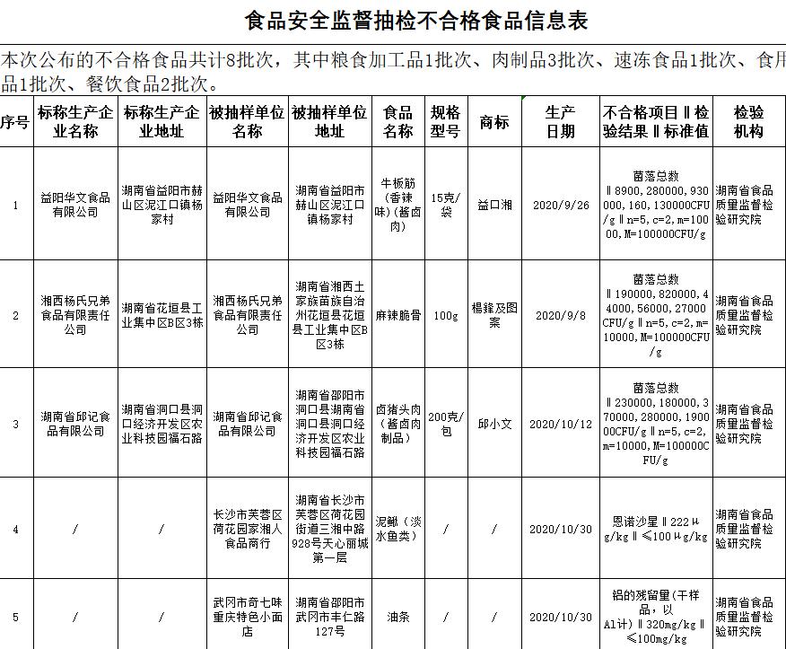 1 月 7 日,湖南省市场监管局发布关于 600 批次食品安全抽样检验情况的公示。近期,省市场监督管理局组织对粮食加工品、肉制品、方便食品、速冻食品等 12 大类食品 600 批次样品开展了食品安全抽样检验,根据食品相关标准检验和判定,其中 8 批次样品不合格。