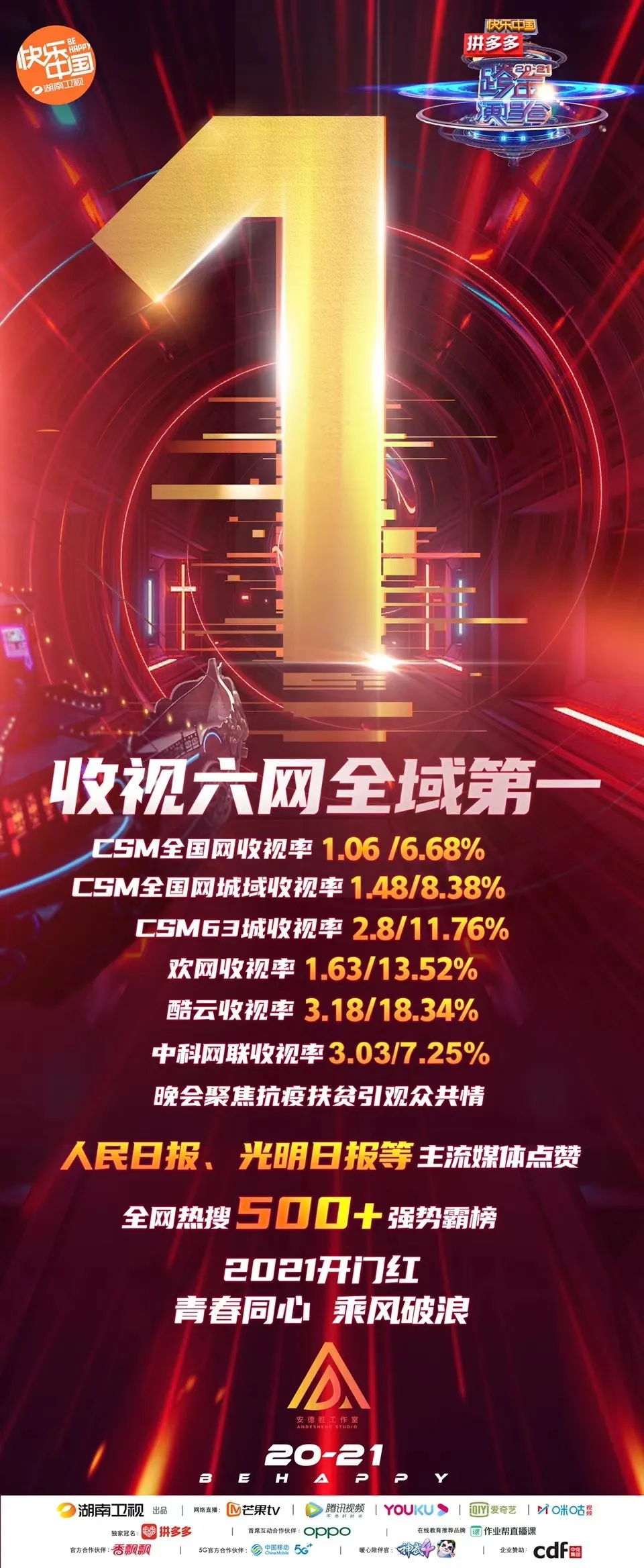基于全国海量10亿+用户的绿色实时收视数据显示,湖南卫视跨年全时段全域全国民观众制霸领先,收视六网全域第一。