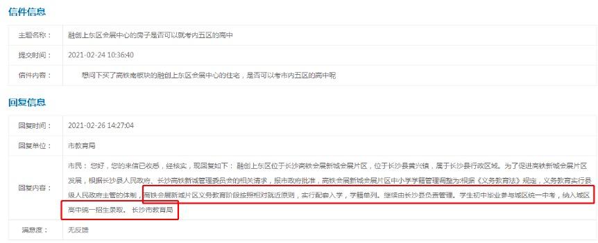 该回复还称,为了促进高铁新城会展片区发展,根据长沙县人民政府、长沙高铁新城管理委员会的相关请求,报市政府批准,高铁会展新城会展片区中小学学籍管理调整为 : 根据《义务教育法》规定,义务教育实行县级人民政府主管的体制,高铁会展新城片区义务教育阶段按照相对就近原则,实行配套入学,学籍单列。继续由长沙县负责管理。学生初中毕业参与城区统一中考,纳入城区高中统一招生录取。