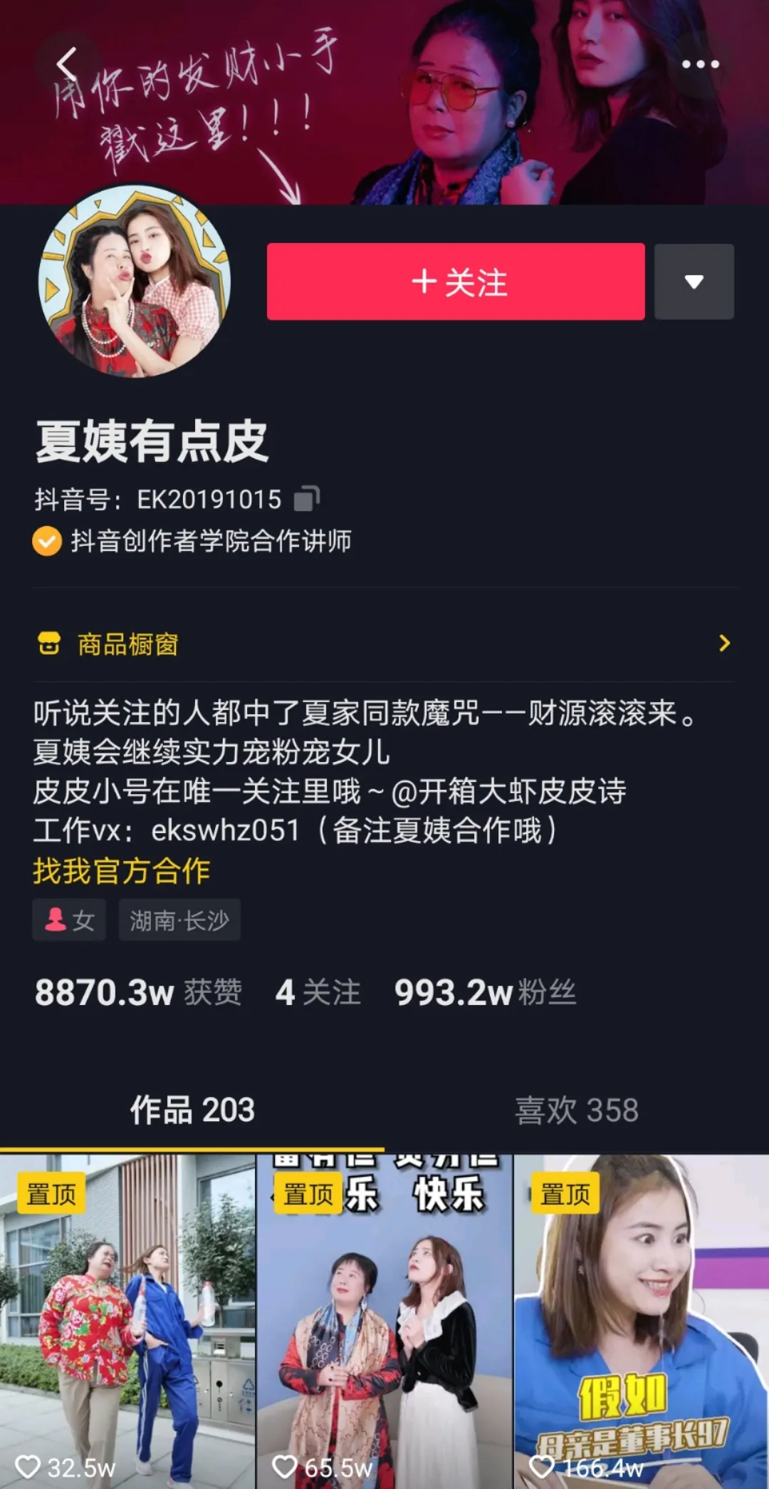 @夏姨有点皮 是由二咖传媒孵化的职场轻剧情账号,目前全网粉丝1200w+。荣获抖音年度最有价值达人奖、年度人气50强。以轻松幽默的风格外加豪横的董事长母女人设,演绎家庭、职场及社会中与金钱、阶层相关的段子,并讽刺拜金、拜权等社会现象,深受大众喜爱。