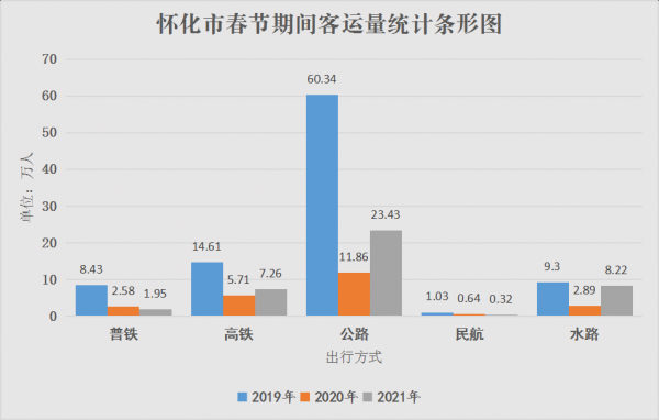 其中,普铁发送1.95万人次,同比2020年下降24.31%,同比2019年下降76.86%;高铁发送7.26万人次,同比2020年上升27.22%,同比2019年下降50.32%;公路发送23.43万人次,同比2020年上升102.16%,同比2019年下降61.17%;水路发送8.22万人次,同比2020年上升184.92%,同比2019年下降11.62%;芷江机场发送3165人次,同比2020年下降50.07%,同比2019年下降69.41%。