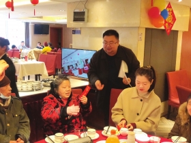 在天心区金盆岭街道湘悦酒店的大厅里,一起吃团圆饭的还有另外7个家庭的居民。就餐者既有年老独居的低收入人士,还有好学上进的寒门子弟,大家一起吃了一席美味的团圆饭,还从人大金盆岭街道工委副主任巩铂予手中接过600元“压岁钱”。