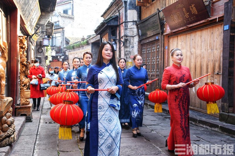 此外,古城里还进行了丰富的民俗巡游活动,舞狮、花船、花篮、腰鼓、霸王鞭、苗族盛装及非遗蜡染旗袍秀等颇具特色的民俗文化表演亮相古城,形成了一道道靓丽的风景线,丰富多彩的年俗文化,吸引众多游客拍照片、录视频、开直播,近距离体验凤凰浓厚的传统年俗文化魅力。