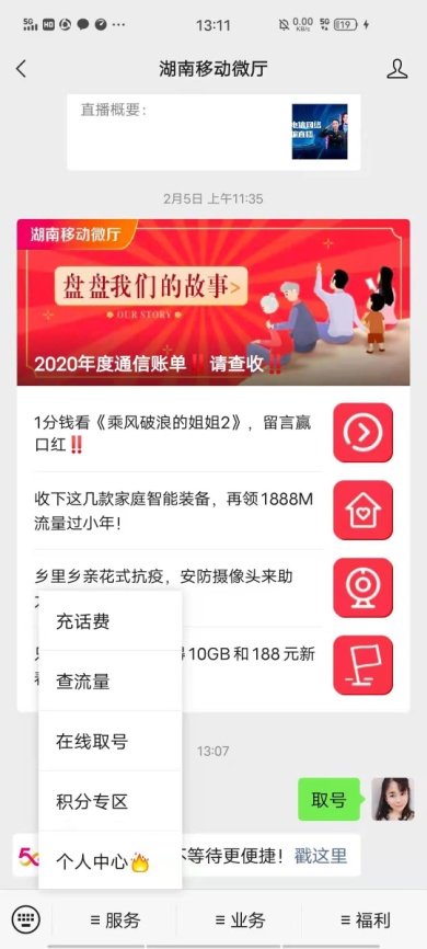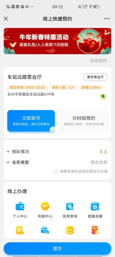 通过中国移动APP、湖南移动微厅公众号提供线上便捷服务,让客户足不出户就能轻松查询业务、缴费充值、订购流量包、宽带自助排障等服务,关注“湖南移动微厅公众号”,在“服务”菜单还可进行“在线取号”,便捷查询您身边的营业厅地址以及营业时间,减少排队时长。