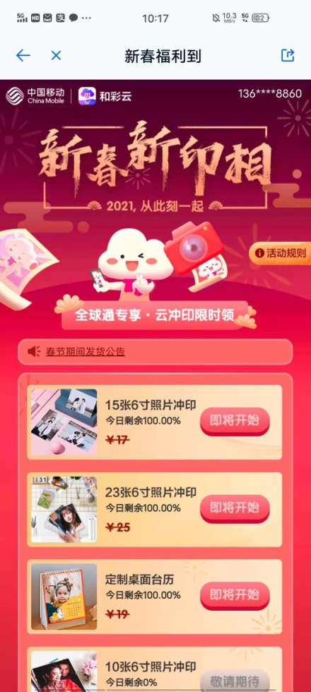和彩云网盘为移动客户免费提供40G(个人20G+家庭20G)云存储空间,满足用户手机相册、微信文件等数字资产的备份同步、在线管理、共享等需求。即日起至2021年6月30日每日12:00开始,全球通用户还可免费领取一份冲印权益,可免费冲印您春节期间拍摄的美好照片、定制桌面台历。具体活动规则请登录和彩云网盘查看。(通讯员:陈凡军 汪炜 覃湘君)