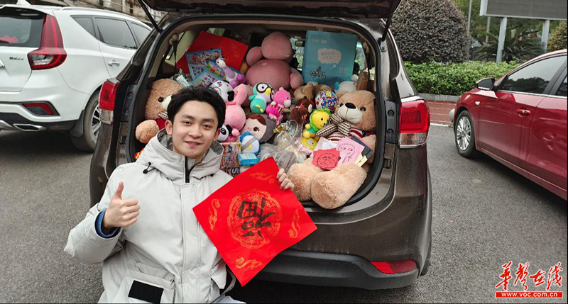 华声在线2月7日讯(通讯员 赵瞳铱 毛梦菲 向冰冰)红彤彤的春联、各种呆萌可爱的玩偶公仔、还有一封鼓励关怀的信件……2月3日,邵阳市特殊学校的杨一帆收到了重庆大学“七彩动画城”志愿者团队送去的新年礼物,让他开心得手舞足蹈。