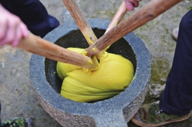 郴州桂东青山乡彩洞村,村里的男人们在用木棍捣糍粑,糍粑在舂捣、揉捻中变得柔软而有韧劲。组图/记者金林