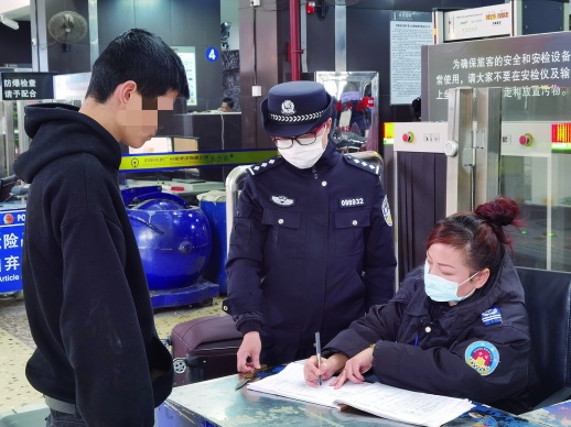 ▲安检人员正在对携带酒精进站的旅客进行登记、教育。