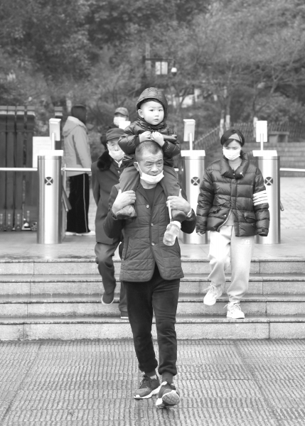 2月2日,长沙岳麓山景区,家长带着孩子刚刚从景区走出。图/记者谢长贵