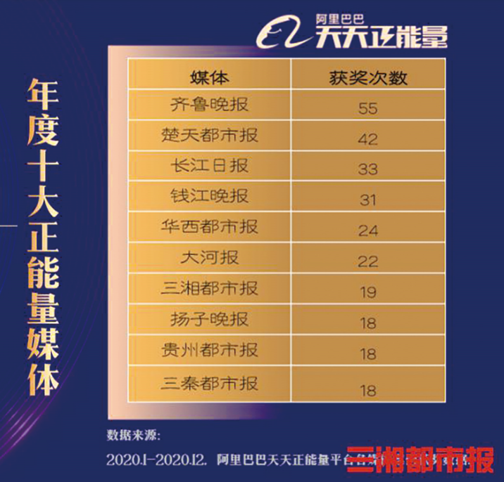 《2020年度公益报告》的正能量榜单折射的是一个个省市的人心热度,也是当地媒体的正能量指数。报告显示,2020年获得正能量奖励次数最多的十大媒体分别是齐鲁晚报、楚天都市报、长江日报、钱江晚报、华西都市报、大河报、三湘都市报、扬子晚报、贵州都市报、三秦都市报。三湘都市报在榜单中名列第七。