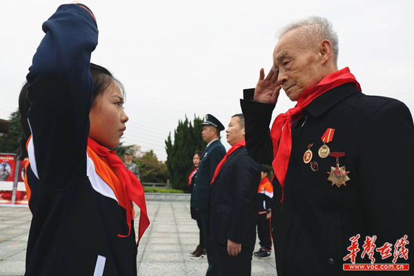 英雄因崇高而不朽,精神因传承而闪耀。雄壮的国歌声中,8岁小学生高呼“向英雄致敬!”向80岁老兵李昌厚庄重地敬了一个少先队员礼。此时,李老举起沧桑的右手给他回了一个军礼,嘴里说着:“我不是英雄,我是一名普通的兵……”