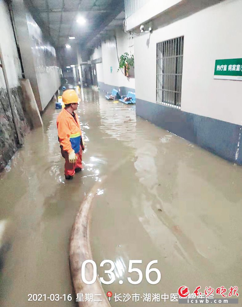 临靠老咸嘉湖路的湖湘中医肿瘤医院负一层存放伽玛刀机房的区域,因倒灌出现大量积水。16日2时30分,刚冒雨巡查完路面的岳麓区市政局大科城片区维护管理所副所长张浩接到排水指令。2时53分,张浩带领7名市政工人、1台大功率抽水车及4台抽水泵到达现场冒雨铺排水管、抽水作业。3时2分,所有抽水设备同时作业,张浩和市政工人们值守在抽水设备和水管旁。一夜坚守,所有人员眼睛熬红了,衣服湿哒哒地黏在身上。直到9时50分,医院负一层的积水才全部排出。他们顾不上休息,继续转战老咸嘉湖路段,直至将该路段积水排干。
