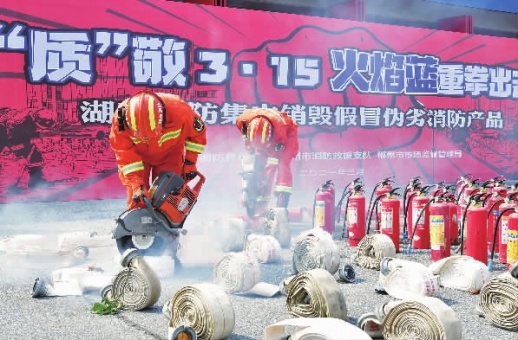 3月15日,我省集中销毁一批假冒伪劣消防产品,并进行线上直播。