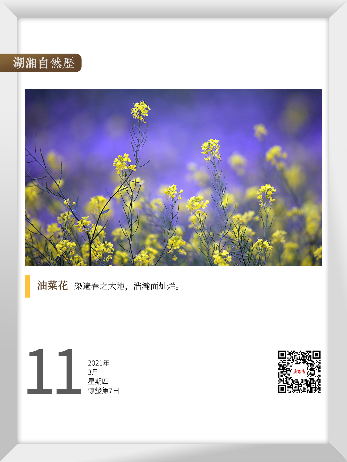 春回大地时,满眼是绿的草、绿的叶、绿的水,直到第一朵绽放的油菜花,推倒大自然的多米诺骨牌,数日间一股燎原之火,“烧”得湖南的漫山遍野一片黄灿灿,何等壮观,令人不由得身心雀跃。