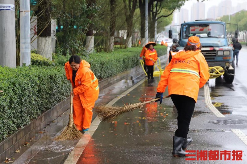 在滨江片区市府周边、大科城、梅溪湖片区等城市主干道两侧,岳麓区环卫工作者细雨中分工协作,手持铁锹、扫帚、铁钩等工具,开展“地毯式”清扫。专业机扫设施以点带面,不仅对辖区主次干道的路面垃圾、墙涂广告、卫生死角、白色污染等进行了全面清理打扫,就连中央护栏、路名牌等卫生死角,都一一清洁到位。