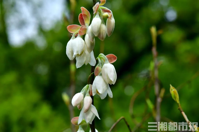 在省植物园的珍稀植物园中,国家Ⅰ级保护植物伯乐树静悄悄地开了花。因每年的四月末五月初,伯乐树上会盛开出形似吊钟的粉红色花朵,伯乐树也有“钟萼木”的美称,伯乐树叶子形似羽毛,柔软轻薄,花朵呈淡粉色。除伯乐树外,另一种濒危国宝级植物长果秤锤树,也以隐居避世的姿态安静地开花、结果。长果秤锤树,数量稀少、分布区狭窄,是我国特有的珍贵园林观赏树种,被称作植物中的“活化石。长果秤锤树开花时,细长的花梗上会垂着洁白的花瓣,散发出阵阵清香,果实极具特色,形似"秤锤",这也是其名字的由来。