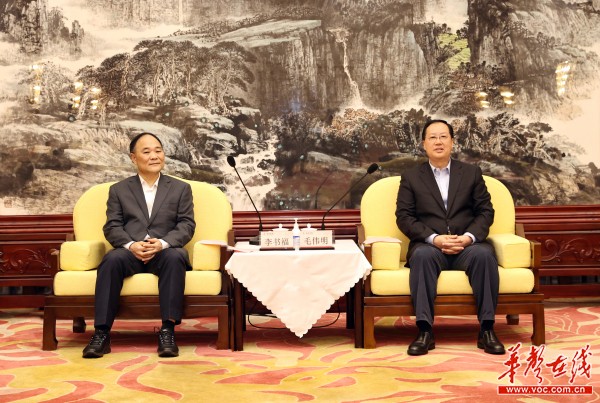 (4月29日中午,省委副书记、省长毛伟明与浙江吉利控股集团董事长李书福座谈并共同见证湘潭市与吉利汽车集团签署新能源SUV项目落户协议。图为毛伟明与李书福座谈。)