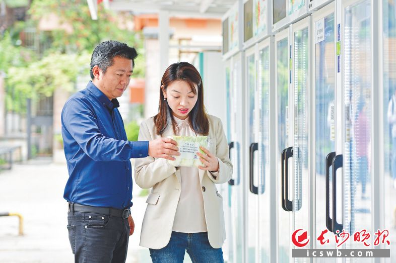 4月19日,通用时代国际社区,熊征其(左)和妻子黄慧在检查智能生鲜柜的菜品。 长沙晚报全媒体记者 王志伟 摄