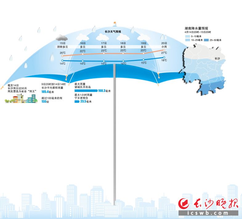 长沙晚报4月14日讯(全媒体记者 张洋子 通讯员 张倩 罗丹)“猜猜今年,那个省会城市雨天最多?”在中央气象台发起的微博投票中,长沙高票夺冠。截至4月14日,长沙今年已出现50个雨日,广大市民网友都开启吐槽模式:“出一天太阳,下一周雨。”“长沙出太阳是违法吗?”大伙都想知道,这雨水还会下个没完没了吗?