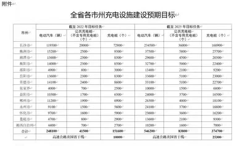 意见提出,到2025年底前全省将建设运营充电桩40万个。长株潭城市圈公共充电桩与电动汽车比例达到国内先进水平,3市核心区公共充电设施服务半径小于1公里,高速公路和国省干线充电站间隔少于50公里。