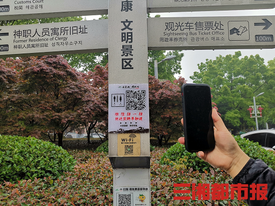 (4月11日,橘子洲景区内,游客正在扫码找厕所。记者 胡锐 摄)